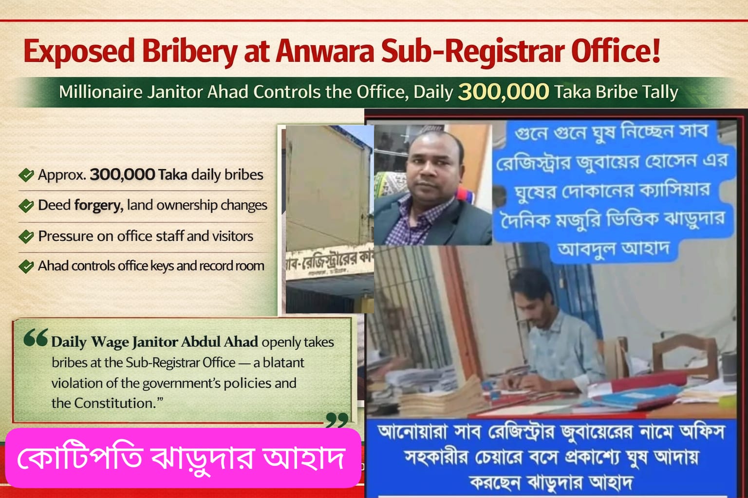 সাব রেজিস্ট্রারের নির্দেশে দৈনিক ভিত্তিক ঝাড়ুদার আনোয়ারা সাব রেজিস্ট্রারের ঘুষের দোকানে অফিস সহকারীর চেয়ারে বসে প্রকাশ্যে ঘুষ আদায় করেন কোটিপতি ঝাড়ুদার আহাদ।