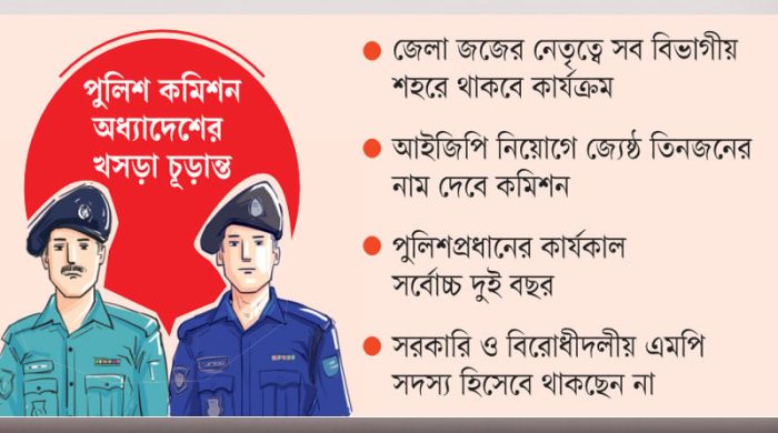 পুলিশ কমিশন অধ্যাদেশ, ২০২৫-এর প্রস্তাবিত খসড়া চূড়ান্ত করেছে আইন মন্ত্রণালয়। এতে নতুন বেশ কিছু বিষয় যুক্ত হয়েছে। বিভাগীয় পর্যায়ে পুলিশ কমিশনের একটি কাঠামো রাখা হয়েছে। এর নাম থাকবে ‘জবাবদিহিতা ইউনিট’।
